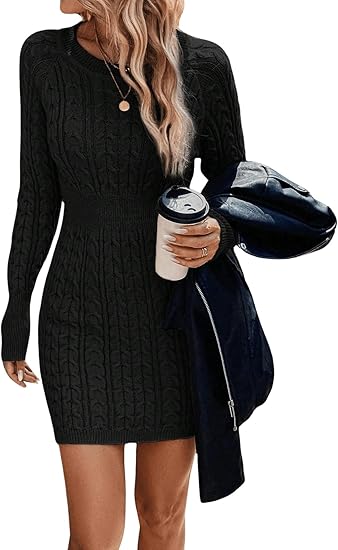 🖤🍂LOVE THIS Women's Plain Round Neck Cable Knit Bodycon Sweater Dress Elegant and Casual Design!!! 💃This women's sweater dress features a round neckline and plain pattern. It is a bodycon style with long sleeves, perfect for daily outdoor wear.